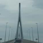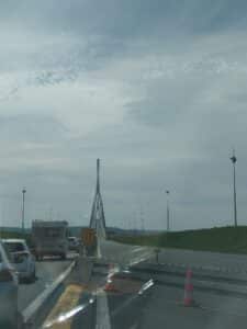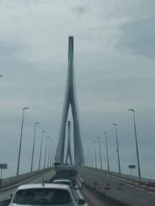 Weiter ging die Fahrt über die A2, auf die A 29 über Amiens Richtung Le Havre zur Pont de Normandie wo uns der erste große Stau erwartete…. Schon an der Vorbrücke über den Hafen von Le Havre staute sich die Verkehrt vor der Mautstation der Pont de Normandie zurück. Die Mautstation war aber, wie wir später feststellten, nicht der eigentlich Grund für den Stau sondern die Baustelle auf der Brücke, wo statt 4 Spuren nur noch zwei zur Verfügung standen.