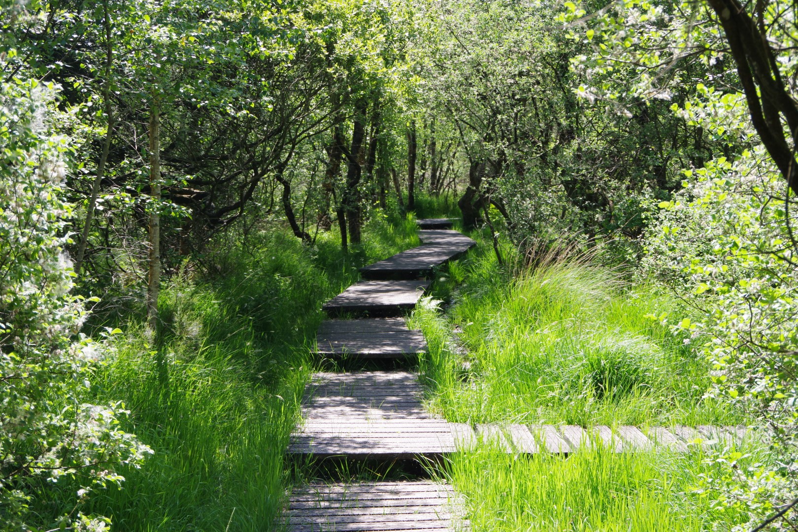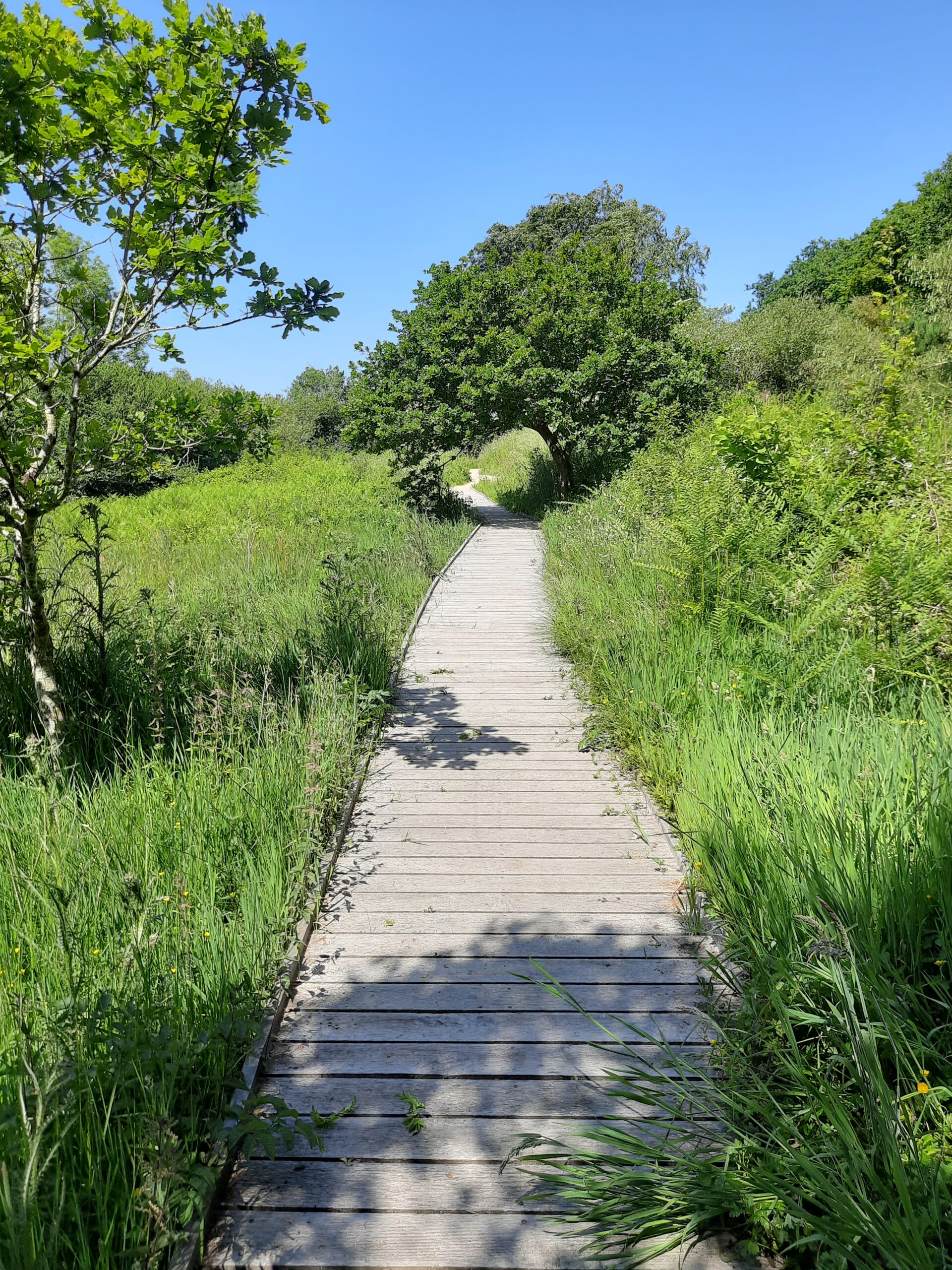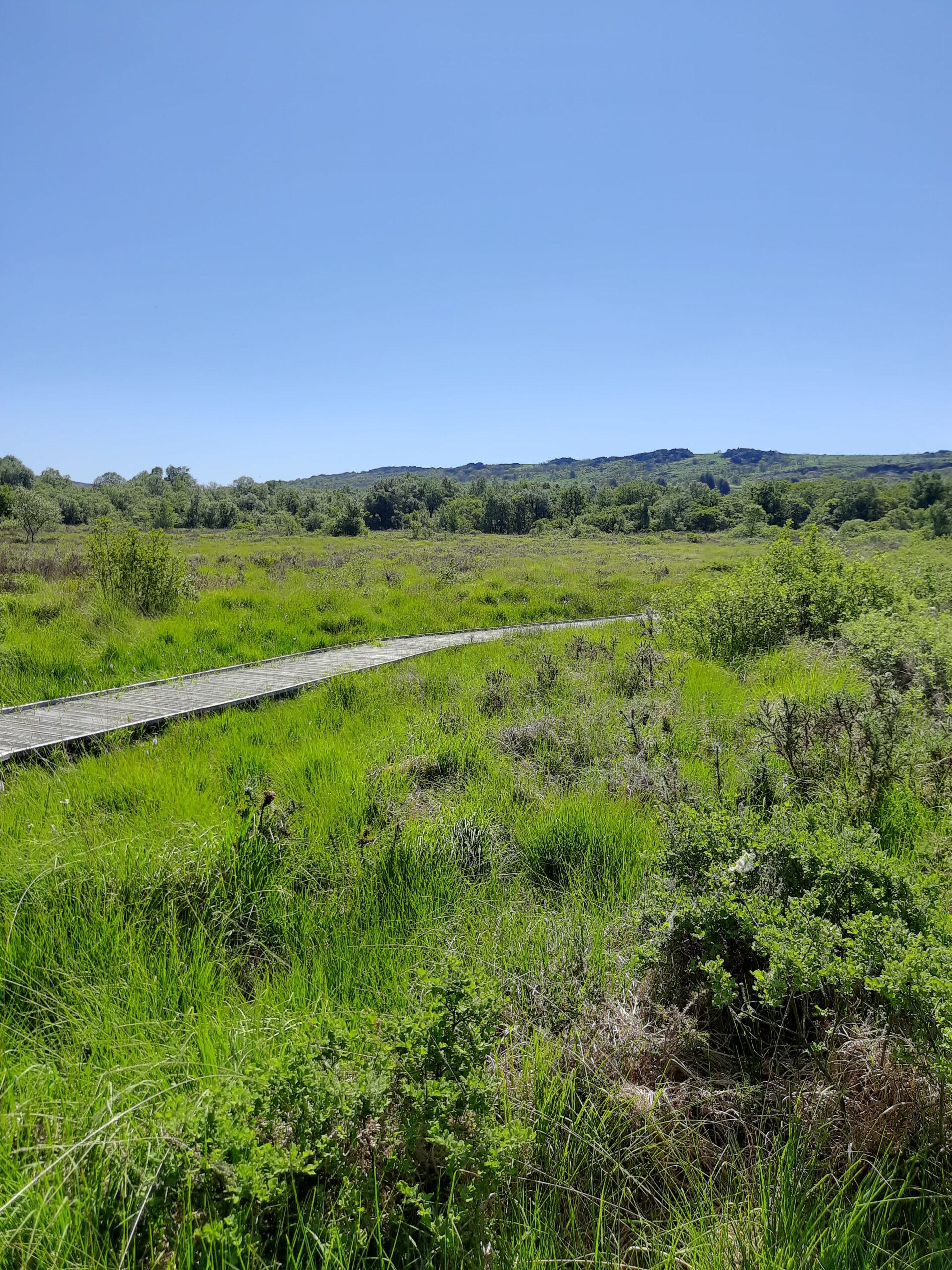 Wir fuhren bei schönstem Sonnenschein wieder zum Parkplatz an der Allée couverte und stellten dort unser Auto ab. Auf der anderen Straßenseite führt ein Weg in den Wald, hier ist der Startpunkt. Der Weg führt größtenteils über gut befestigte Wege durch Wald-, Moor- und Heidelandschaften. Teilweise auch auf Holzbohlenwegen. An einigen Stellen waren vielleicht auch mal Infotafeln angebracht. Von diesen waren dann aber nur noch die Pfosten vorhanden. Das letzte Stück des Wegs teilte sich ein kleines Rinnsal den Weg mit den Wanderern. So kamen wir nach etwas mehr als einer Stunde wieder am Auto an und fuhren zurück Richtung Plougar. Die Beschreibung für den Wanderweg findet man (Stand Juni 2023) >>hier<<. Ein sehr schöner Rundweg durch die Natur mit schönem Ausblick auf die Monts d’Arrée.