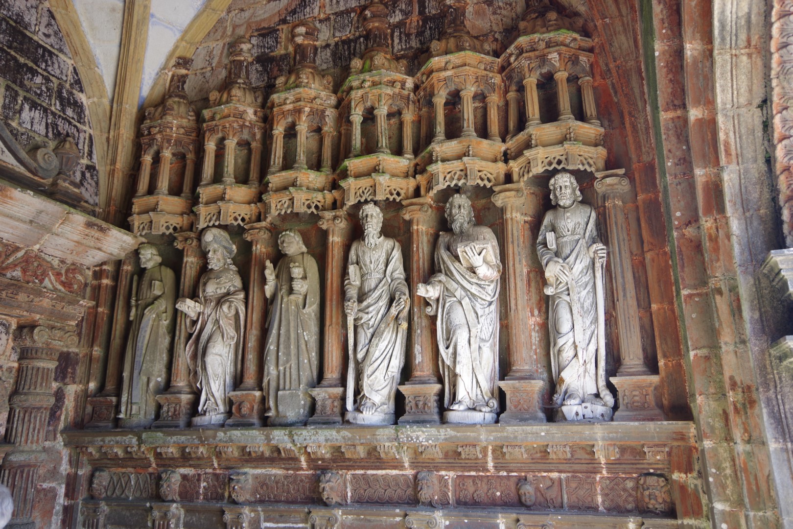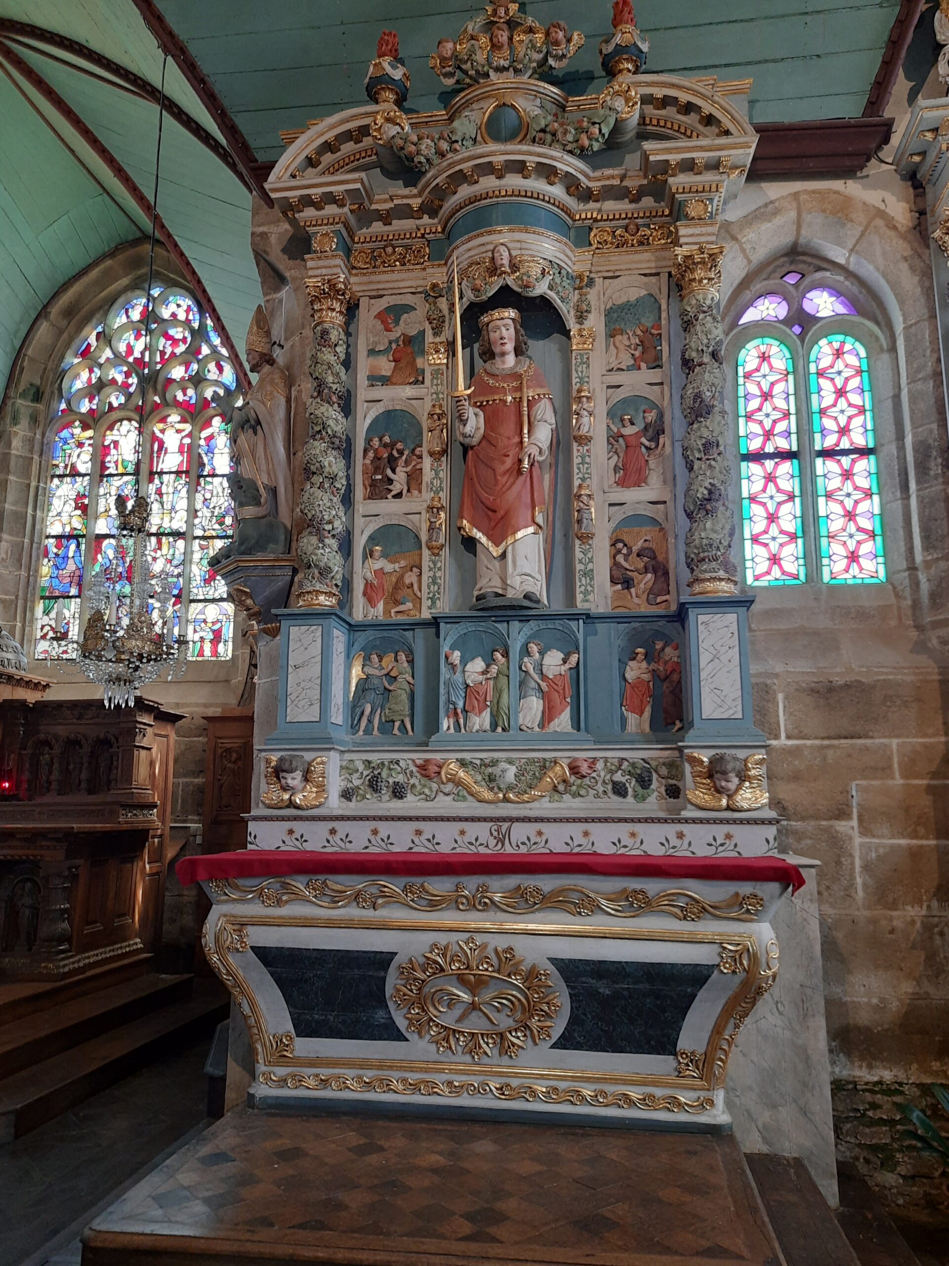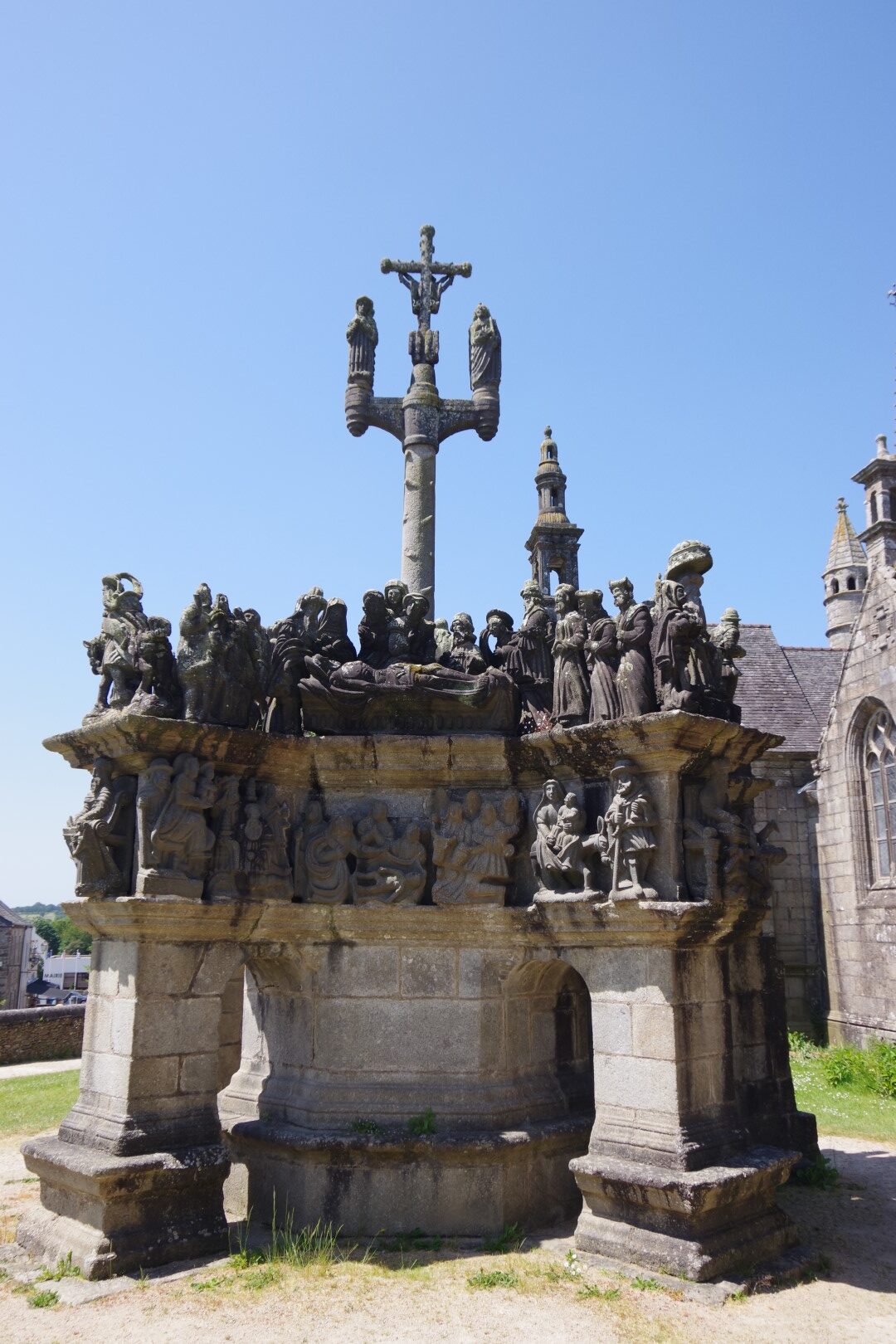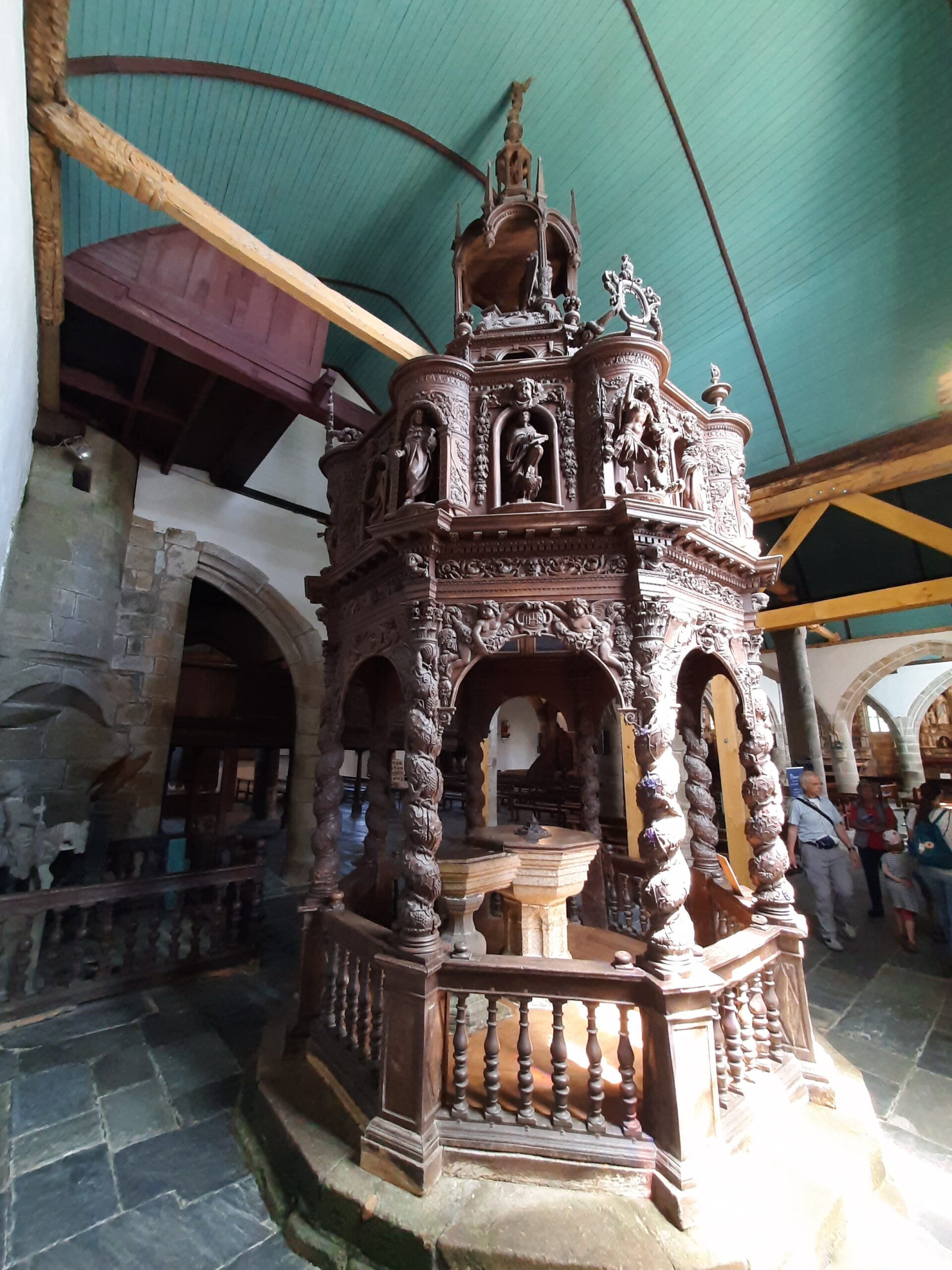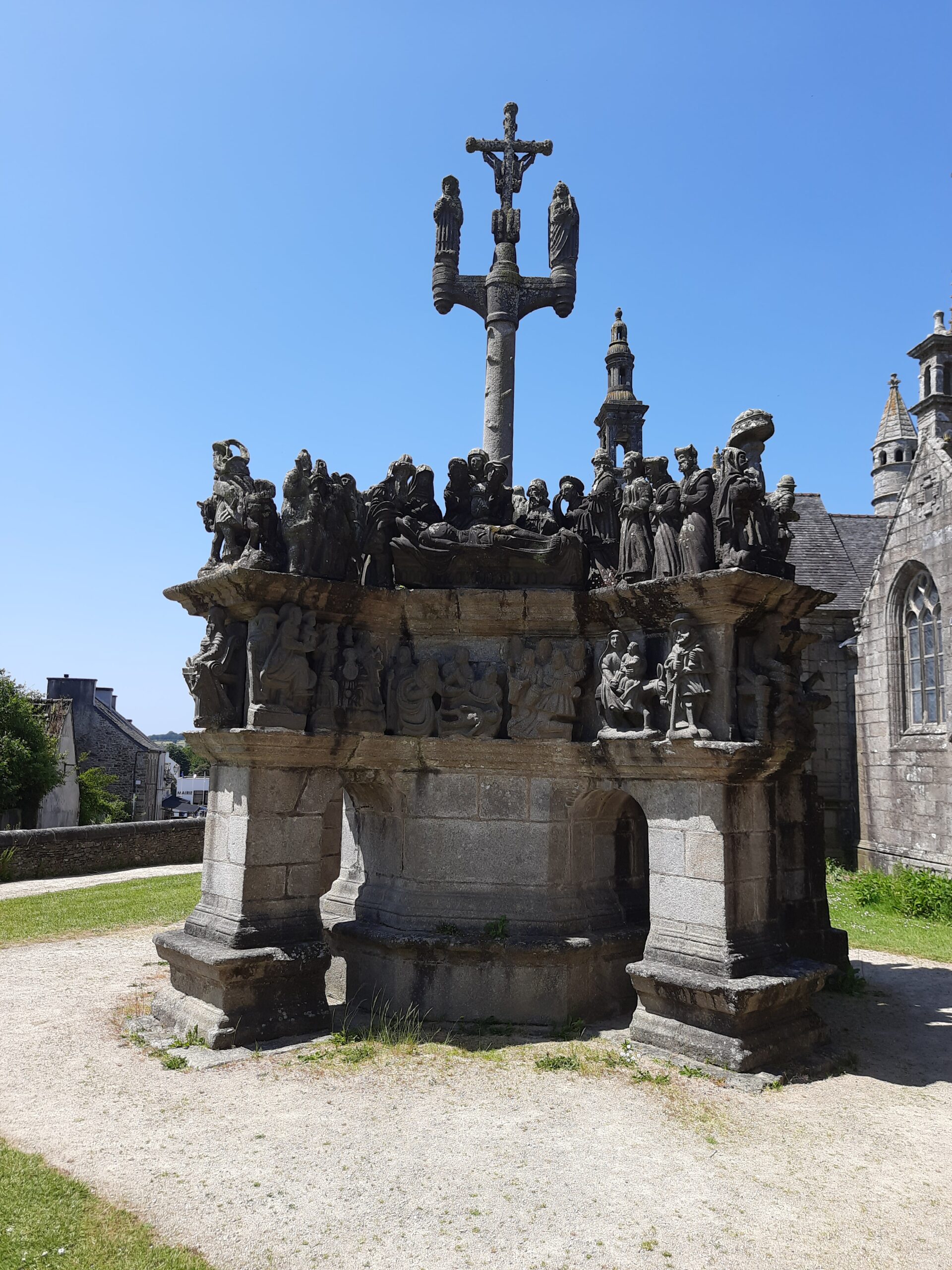 Auf dem Rückweg kamen wir durch Guimiliau. Das Örtchen haben wir schon 2012 bei unserer Rundfahrt zu den Calvaires mit unserem Hund Luna besucht. Aber wo wir schon mal da waren, fuhren wir im Ortszentrum auf einen Parkplatz und machten uns auf den kurzen Weg zum umfriedeten Pfarrbezirk mit dem berühmten Calvaire. Auch ein Blick in die Kirche durfte natürlich nicht fehlen. Anschließend setzten wir unsere Fahrt zum Ferienhaus in Plougar fort.