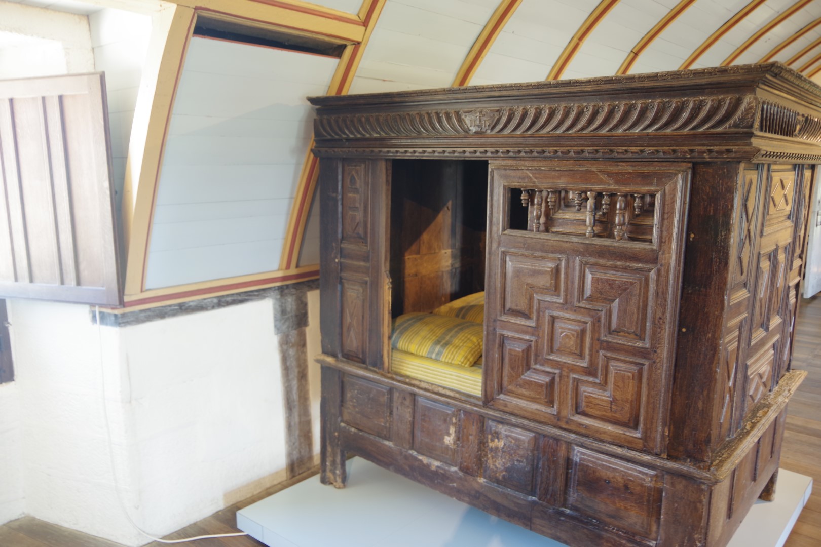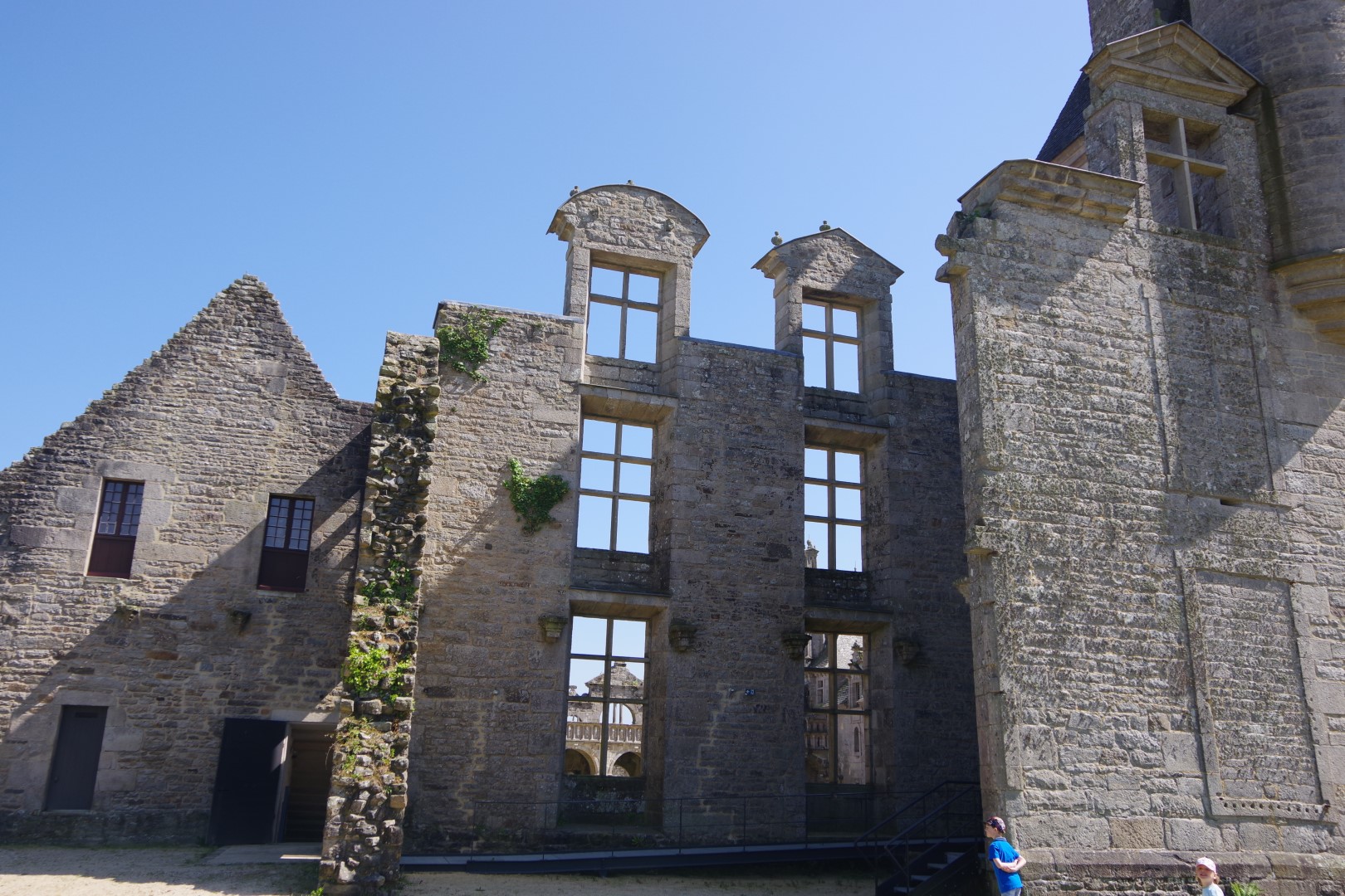 Nach einer Kaffeepause machten wir uns dann auf den Weg zum Château de Kerjean, dass quasi bei uns „um die Ecke“ liegt. Die großzügig angelegten Parkplätze liegen zum Teil unter Bäumen und so gut vor Sonne geschützt. Der Fußweg zum Eingang führt über eine lange Prachtstraße zum Schloß. An der Kasse erwartete uns eine Überraschung: Das Schloss nahm an einer, an diesem Wochenende stattfindenden Aktion teil, bei der sich 4 Schlösser im Finistère präsentieren. Der Eintritt war heute kostenfrei. Nach Angabe unserer Nationalität erhielten wir ein kleines Heftchen mit den wichtigsten Informationen in deutscher Sprache und konnten unseren Rundgang durch das Schloss beginnen. In den ersten Räumen wird viel über die Geschichte des Schlosses berichtet in anderen Räumen werden frühere Ausstattungen solcher Orte wie z.B. Schrankbetten gezeigt. Im Hof, auf den auch der alte Brunnen des Schlosses zu sehen ist, wurde ein Souvenirshop und Café eingerichtet in dem die Kinder jeweils ein Eis erstanden.